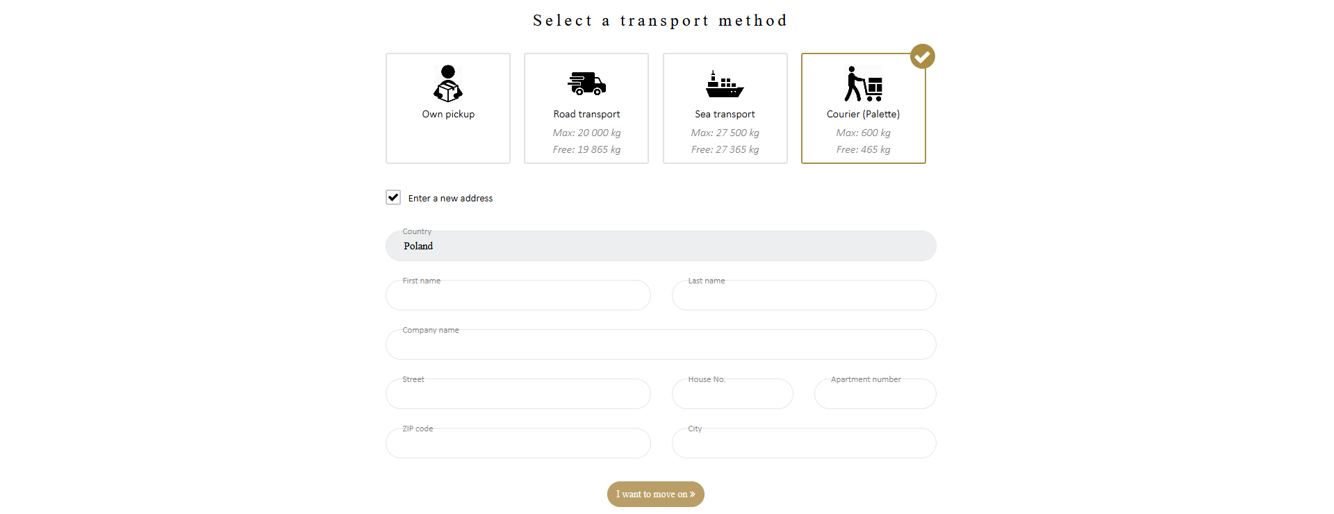 Po wybraniu kraju dostawy lista metod dostawy dostępnych dla tego kraju jest automatycznie ładowana. Metody dostawy można skonfigurować w różnych opcjach w panelu administracyjnym.